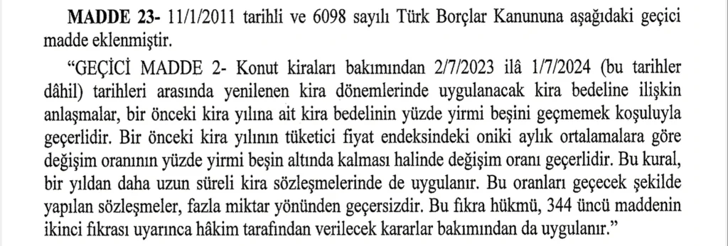 Kiracıların merakla beklediği, kira artışlarına %25 sınırı getiren düzenleme 1 Temmuz 2024 tarihine kadar uzatıldı. 15 Temmuz 2023 tarihli Resmi Gazete’de yayınlanan Geçici Madde’ye göre;